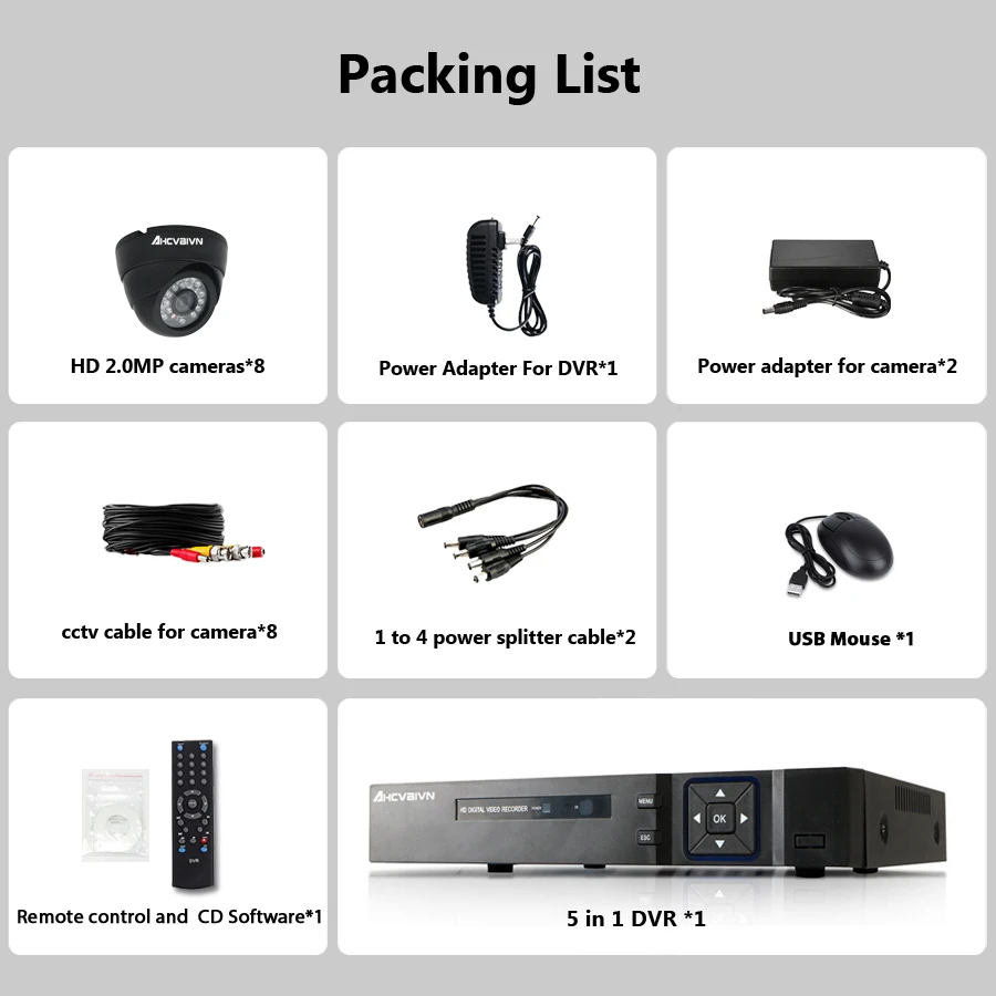 1080P CCTV System 8CH AHD-NH DVR 1080P 2.0 MP Black indoor Security Camera 3000TVL Dome CCTV Camera